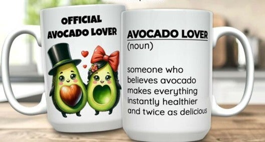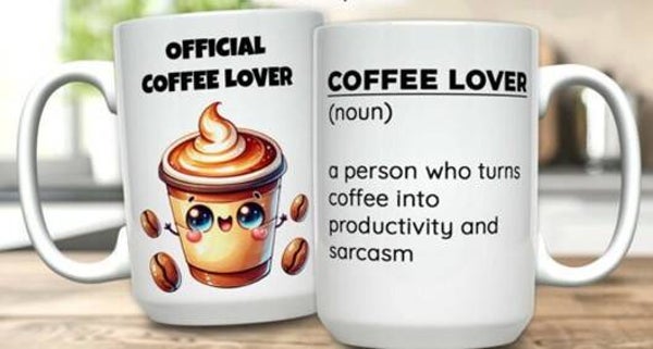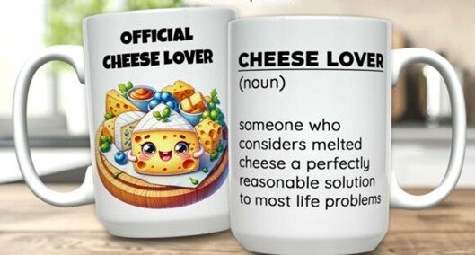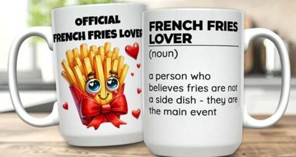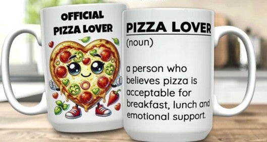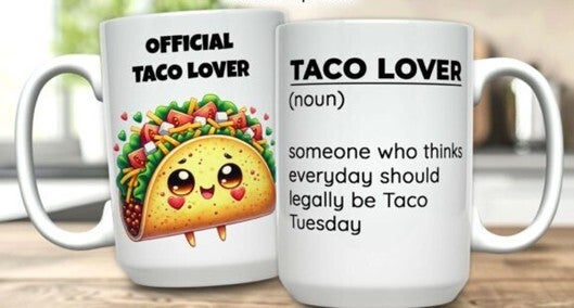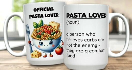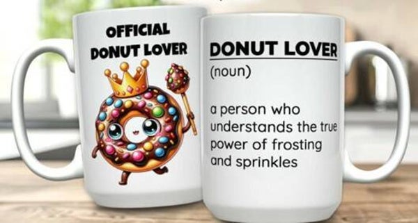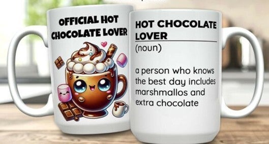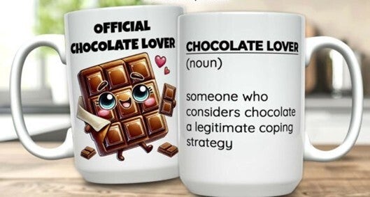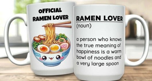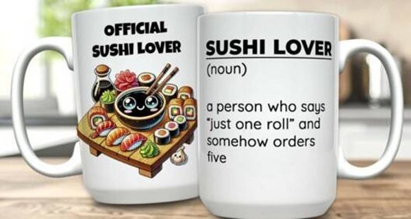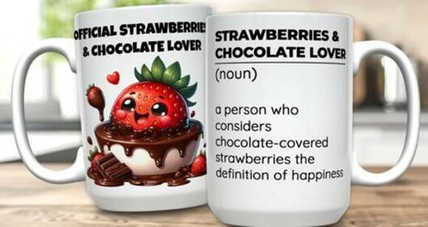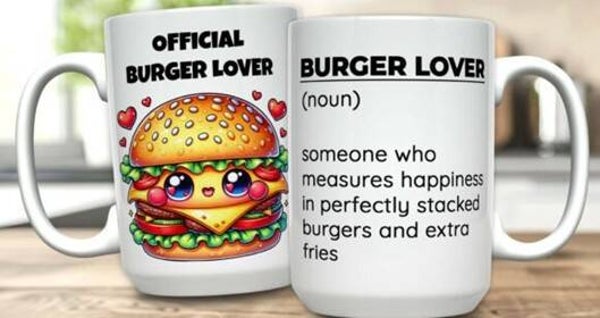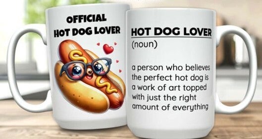 Mokken die bedrukt zijn met eten, koffie, cholade en ijsje.