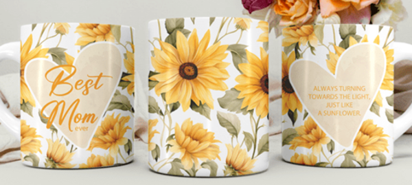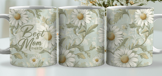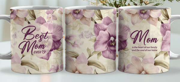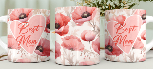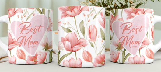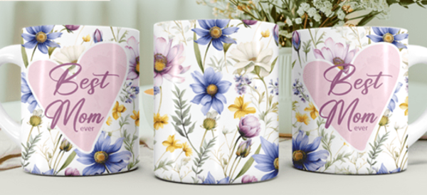 Mokken voor moederdag of een verjaardag van een moeder met daarop bloemen en de tekst Best Mom